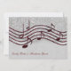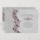 Joli faire-part de mariage avec un motif vintage damassé en gris pâle et défiguré, recouvert d'un personnel de musique rouge étincelant et de notes. Idéal pour les amateurs de musique !