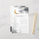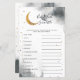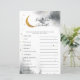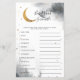 Mignonne sur le thème de la lune baby shower bébé mot scramble carte avec aquarelle en gris avec fausse lune d'or et étoiles. La liste des mots sur cette carte sont tous liés aux bébés et ils sont brouillés. Les invités vont rivaliser qui peut les débrouiller tous en premier ! RÉPONSE CLÉ : 1. siège de voiture 2. lait 3. parc 4. sucrerie 5. couche 6. fauteuil roulant 7. pépinière 8. moniteur pour bébé 9. pédale 10. formule 11. canard en caoutchouc 12. poussette.