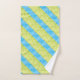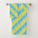 Symmetrical grid of crumpled paper textures in alternating greenish-yellow and light blue, creating a vibrant, tactile striped pattern with depth and visual rhythm
