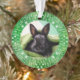 DIY a precious ornament. Upload your own photo of your rabbit or other pet to this watercolor green holiday tree ornament with white chalk designs. Name and year and "holidays with" on one side. Your cutest bunny rabbit photo on the other.