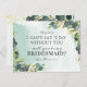 Si vous cherchez à demander à quelqu'un d'être votre demoiselle d'honneur pour votre futur mariage, alors pourquoi ne pas choisir ces cartes postales d'invitation de demoiselles d'honneur rustiques. Cette invitation personnalisée fera de votre ami, soeur, cousin, nièce, fille ou qui que ce soit d'autre que vous choisissez sentir que spécial.Cette carte comporte d'élégants feuilles d'eucalyptus botaniques aquarelle, des éclaboussures d'or, et le libellé "Je ne peux pas dire "Je le fais" sans vous".