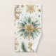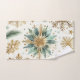Serviette de bain festive et élégante avec un motif de vacances vert et or avec flûtes d'aquarelle, flocons de neige, feuilles de pin et ornements. Mélangeant éléments géométriques et botaniques abstraits avec une touche bohème, il est parfait pour le décor de salle de bain d'hiver et d'automne.