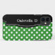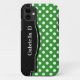 Coque iPhone 5 élégant conçu avec un pois blanc sur motif vert, un cadre noir sur le côté gauche, et personnalisé avec votre nom ou texte personnalisé en blanc sur le cadre noir. Cette conception est parfaite pour l'utilisation verticale et horizontale de l'iPhone 5.