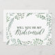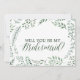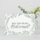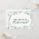 Cette couronne verte rustique sera-tu ma carte de demoiselle d'honneur est parfaite pour un mariage extérieur. Le design se compose d'un cadre magnifique et fantaisiste de feuilles d'aquarelle, de plantes et de verdure. Customisez la carte avec le nom de la mariée et de la demoiselle d'honneur.