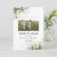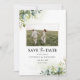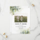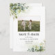 Green Save The Date avec Carte photo. Cette invitation à la douche nuptiale élégante et élégante présente de magnifiques aquarelles peintes à la main. Trouvez les articles correspondants dans la Collection Florale Eucalyptus de verdure.
