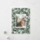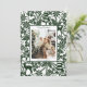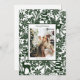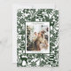 La scène d'une forêt en hiver est le thème de cette carte de Noël. Le design se compose de végétation forestière comme des pinecones, des arbres enneigés et des fleurs, ainsi que des cerfs. Votre photo de Noël sera placée au centre de la carte entourée du design vert et blanc.