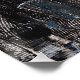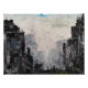 A cityscape stands shrouded in mist, with dark, textured buildings rising on either side of a deserted street. The contrast between the stark structures and the obscure background creates a mysterious and somber atmosphere.