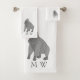 Bath towel set, consisting of a face cloth, hand towel and bath towel with a gorilla design. You can customise this bath towel set with any text of your choice. Should you require any help with customising then contact us through the message link on this page. Gorilla design bathroom towel set