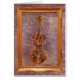 Dessin au trait d'un violon consisté en des flourishes et des rouleaux d'ornamental accroche dans un cadre en bois découpé sur un arrière - plan en bois peint