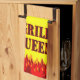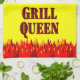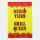 Grill Queen drôle barbecue disant dans une police flamboyante occidentale pour cuisiniers et cuisiniers. Avec un art graphique des flammes rouges et orange sur une serviette jaune.