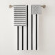 Cet ensemble amusant présente des rayures noires classiques dans des tailles différentes sur chaque serviette.  L'arrière - plan est d'un blanc immaculé.  Chaque serviette peut être achetée séparément si vous souhaitez mélanger les couleurs.