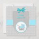 Elégante invitation de baby shower carré faite en bleu aqua, avec texte gris personnalisé prêt à personnaliser. L'arrière de l'invitation se fait dans un motif à pois gris clair et blanc, avec des graphismes doux d'un bébé pram bleu aqua et un arc bleu satin d'aqua lumineux. Personnalisez le texte gris foncé, pour votre baby shower.