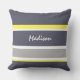 Faites une déclaration avec ce coussin rayé gris, blanc et jaune vif ! Votre nom ou autre texte est dans le script moderne au centre. Vous pouvez facilement supprimer le texte, ou même modifier la police. Le motif à bande est répété à l'arrière du coussin, sans le texte.