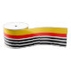 Ruban à motif rayé jaune, rouge, noir et blanc. Créé pour coordonner avec les Souvenirs espagnols la gamme d'artisanat et de matériel de fête.