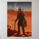 Un guerrier viking avec armure et bouclier debout sur la planète rouge Mars avec deux lunes sur le ciel. C'est un art généré par l'IA.