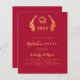 Arrière - plan rouge. Une couronne de laurier classique et une casquette de graduation. Personnalisez et ajoutez l'année, le nom et les détails. Texte doré. 1 feuille = 1 invite imprimé bord à bord.