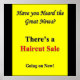 Something for everyone offers customized personalized haircut sale poster especially designed to promote and market your business. This uniquely designed haircut sale poster will not only bring a smile to your clients but they will also enjoy telling their friends about it. As a licensed cosmetologist I know firsthand the importance of promoting a salon, therefore it is wise to continuously change and market your shop as your clients’ needs increase. Happy promoting everyone…Good luck!