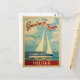 Ce salutations de Halifax Canada design nautique de voyage vintage comprend un bateau naviguant sur l'eau avec des mouettes et un ciel bleu rempli de somptueux nuages blancs bouffants.