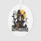 Halloween, entrez dans l'humeur éffrayante. Une scène d'Halloween éffrayante se déroule avec la silhouette d'une maison hantée sur fond de lune orange vif. La maison, avec ses fenêtres menaçantes et une figure fantomatique flottant à l'extérieur, est haute et mystérieuse. Deux arbres nus, leurs branches tendues comme des doigts squelettiques, encadrent la maison, ajoutant à l'atmosphère étrange. Un citrouille sculpté avec un sinistre sourire se trouve au premier plan, ajoutant une touche d'horreur ludique. Le mot "HALLOWEEN" est enroulé à travers le fond, avec des toiles d'araignée, ce qui signifie le charme éffrayant du jour férié.