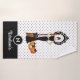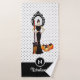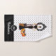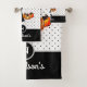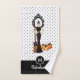 Conçu par Farida Greenfield. Illustration de mode d'une dame portant une superbe robe noire classique élégante tenant un balai sorcier décoré de rubans noirs avec des citrouilles au premier plan et un motif pois noir et blanc à l'arrière - plan. Il a personnalisable monogramme initial et nom sur le côté inférieur. Conception parfaite avec thème Halloween.