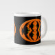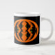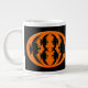 Cette énorme tasse présente un ovale orange avec six corbeaux. Chaque corbeau a des yeux jaunes avec des élèves noirs et des ailes étirées. Les corbeaux volent vers l'autre formant une forme ovale. L'arrière - plan est noir.
