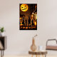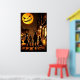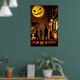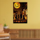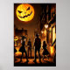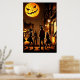 Les gens s'habillent pour Halloween et marchent dans la rue en ville la nuit avec une lune citrouille dans le ciel. C'est un art généré par l'IA. L'art à thème Halloween