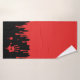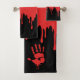 Serviette d'Halloween sertie d'illustrations faux rouge gouttant de sang et une main éffrayante pleine de gouttes de sang rouge sur un arrière - plan noir. Décor de salle de bain idéal pour ce vacances d'octobre.