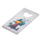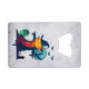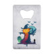 Un ouvre-bouteille de style carte de crédit avec une illustration d'halloween cool. Placez-vous sur un arrière - plan gris. Un grand épouvantail avec une tête de citrouille, portant un casquette de sorcières. Il a un sourire menaçant portant des robes en lambeaux et se tient dans un cimetière avec un corbeau qui crie sur son bras. Les chauves-souris qui volent au loin, une pleine lune dans l'arrière - plan et un hibou solitaire aux yeux brillants se trouvent sur une pierre tombale.