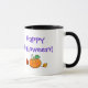 Profitez de votre boisson chaude d'automne préférée avec cette mignonne tasse, avec un chat noir en costume de sorcière violette avec citrouille plein de bonbons, et au verso un citrouille mignon avec les feuilles d'automne et le dicton Happy Halloween!