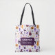 Customisez ce joli tour ou traitez le sac fourre-tout d’Halloween avec le nom de votre enfant. Illustration est amusant Halloween effrayant, collage fantomatique. Des couleurs violettes et jaunes qui rendent ce mignon sac pop! Grand sac qui peut être utilisé pour de nombreux Halloweens à venir! D'autres tailles de sacs fourre-tout, couleurs et styles sont disponibles