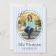 This modern graduation party invitation highlights an oval photo framed by a simple black border and finished with a charming hand-drawn bow. The design is set against a backdrop of soft light blue vertical stripes, creating a fresh and classic look. The backside offers space for a second photo and custom text for your party invite details.