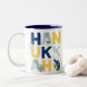 Notre Hanoukka Greeting MUG à deux tons avec un dreidel, menorah, beigne de gelée, et les étoiles juives de David est une belle et amusante façon de souhaiter à la famille et aux amis un Hanoukka heureux dans le style. . Personnalisez avec votre salutation personnalisée au verso pour en faire vraiment un de type. Demandes de renseignements : envoyez-nous un message ou envoyez un courriel à bestdressedbread@gmail.com Happy Hanoukka!
