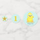 Happy chick avec une étoile sur une table de fête bleu clair confetti. Texte prêt à être personnalisé. Idéal pour baby shower, premier anniversaire et plus.