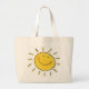 Dessin d'un soleil avec un visage heureux sur un sac en toile de couleur naturelle; les poignées noires sur le sac complètent la bordure noire autour de l'image