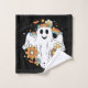 Serviette sertie avec l'illustration d'un fantôme souriant. Décoré de fleurs, arcs-en-ciel et chauves-souris.