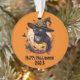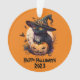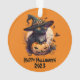 Cet ornement éffrayant d'Halloween est une façon amusante de se souvenir d'Halloween cette année ! L'ornement acrylique rond a un arrière - plan orange citrouille et un graphique d'un chat noir portant un casquette de sorcières est sûr de mettre un sourire sur votre visage. Les chauves-souris volantes et un citrouille sculpté ajoutent une touche de fantaisie, mais le ton général de l'ornement est ludique et amusant. Sous le graphique, le texte "Happy Halloween 2023" est placé dans une police éffrayante d'Halloween en noir pour se souvenir de cette année spéciale.#catlovers#halloweencat
