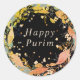 Chag Purim Sameach !. Happy sticker Purim avec une couronne feuilletée sur noir. Le texte peut être customisé ou supprimé.