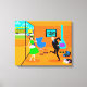 Cette Happy Retro Parents Stretched Canvas Print montre une maman et papa se réjouissant quand leur enfant fait un tiret pour le bus scolaire. Le duo de célébration est dans leur style années 60, moderne du milieu du siècle, salon. La décoration orange est tout sauf sobre. Cheminée à cône turquoise, chaise d'oeuf bleu vif contre mur en pierre orange. Sur le mur, vous trouverez l'impression en toile Stretched Art Moderne du milieu du siècle, disponible au magasin Zazzle de StrangeLittleOnion. Au sol, il y a un lecteur portable bleu et noir avec plusieurs albums de vinyle éparpillés à proximité. Papa, porte un costume noir avec une chemise bleu clair et une cravate bleu foncé. Il dévoile tous ses meilleurs mouvements de danse, le genre de ceux qui amèneraient des rouleaux oculaires de juniors. Maman porte une robe verte et vibrante et un tablier blanc et vif avec garniture bleue. Elle est debout devant des portes coulissantes en verre en agitant joyeusement tandis que son enfant court sur le trottoir avant vers le bus scolaire jaune qui attend. A travers les portes, on peut voir leur pelouse de banlieue parfaitement entretenue et leur proverbiale clôture blanche pour piquetage. Même l'arrière - plan est satisfait d'un ciel turquoise et des silhouettes de cèdres. Tu sais ce qu'ils disent... Quand l'enfant est parti, les parents vont jouer !