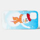 Bleu, neige, coque iphone de vacances d'hiver avec un bonhomme de neige heureux agitant. Le bonhomme de neige se trouve sur une couche séparée, il peut donc être redimensionné ou déplacé facilement.