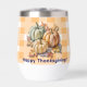 Celebrate the season with this cozy fall design featuring three pumpkins in sage green, tan, and cream surrounded by autumn leaves. The warm orange and white checkered background adds a rustic farmhouse touch, perfect for Thanksgiving décor, invitations, or seasonal gifts. A charming way to say “Happy Thanksgiving” with autumn style!