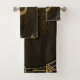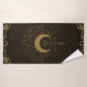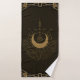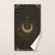Harmonie des éléments : lune, or et géométrie. Là où se cachent les secrets de l'univers, une lune croissant se lève avec une surface qui reflète la lumière des étoiles dans une lueur dorée. La lune se trouve majestueusement dans un cadre circulaire qui agit comme un cercle protecteur, tandis que des lignes dorées coulent de son centre comme des rayons de soleil, perçant l'obscurité. L'arrière - plan noir profond augmente le contraste avec les éléments dorés et crée une atmosphère de mysticisme