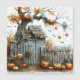 Haunt de récolte - Où les Citrouilles brillent et les fantômes dérivent Carte magnétique d'Halloween Une vieille maison en bois est patinée et attentive, entourée d'une clôture cassée de piquetage enchevêtrée dans des toiles de cobwebs. Des lanternes crêpes brillantes perchent au sol et pendent de branches d’automne, leurs visages sculptés scintillent de désordre. Des figurines grasses s'échappent des arbres, et des chauves-souris traversent le ciel sombre. Les fûts et les paniers débordent de citrouilles et de reliques de récolte, tandis que les feuilles oranges se dispersent comme des chuchotements de saison. La scène mêle charme rustique et enchantement spectral, capturant la tranquillité d’Halloween dans un moment de décadence festive.