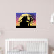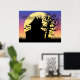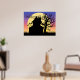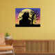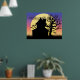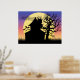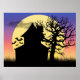 Cette vieille maison hantée et branlante est haute avec l'arbre presque nu à côté. Les chauves-souris volent près de la maison tandis que la lune s'élève derrière elle. Est-ce un nuage qui passe par-dessus pour lui donner un aspect plus déplaisant ou est-ce que la fumée sort de la cheminée ? Le fond de la maison et de l'arbre est couvert d'herbe et de mauvaises herbes. Les couleurs arrière - plans bleu vif, rose et orangé donnent une idée du soleil levant de l'après-midi ou du matin. Choisissez parmi une variété d'affiches et d'estampes.