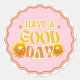 A cheerful pink badge featuring smiling sunflower characters and the uplifting message “Have a Good Day.” Designed with soft pastel colors, playful typography, and a warm, friendly vibe, this illustration spreads positivity and joy—perfect for stickers, greeting cards, planners, or cheerful digital designs.