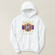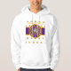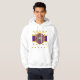 Blanc sweat - shirt à capuche avec des cercles concentriques violets, dorés et blancs au-dessus d'un rectangle violet et or avec "HOLLYWOOD, CALIFORNIA CENTRE OF THE UNIIVERSE" avec des logos Y-NOT-ME dans l'arrière - plan. Ce design est un cri à Hollywood, la capitale du cinéma de la Californie.