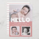 Faire-part de bébé dans un corail rose et blanc poussiéreux avec un montage photo de votre bébé, et leur nom et leurs statistiques de naissance.