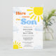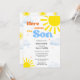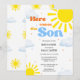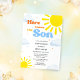 Celebrate your little sunshine with this “Here Comes the Son” baby shower invitation. Featuring a bright sun theme, soft clouds, and cheerful colors, this design brings a warm and joyful feel to your baby boy celebration. BBY003