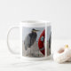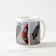 Photo d'un héron bleu sur une plage à côté d'un anneau rouge et blanc. Image répétée trois fois autour de la tasse.