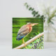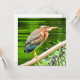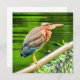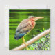 Un oiseau avec un long bec est perché sur une rampe métallique, à côté d'une clôture à chaîne et de verdure, avec un plan d'eau serein dans l'arrière - plan. La scène est vibrante avec le feuillage luxuriant et les reflets dans l'eau.