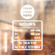 Panneau de fenêtre pour les heures d'ouverture du magasin. Personnalisez-le avec vos heures d'ouverture personnelles. Texte supplémentaire de non-solicitation et de non-toilettes publiques qui peut être personnalisé pour répondre à vos besoins. Ajoutez le logo de votre magasin en haut. Affichez-le sur la fenêtre avant ou la porte de votre établissement.